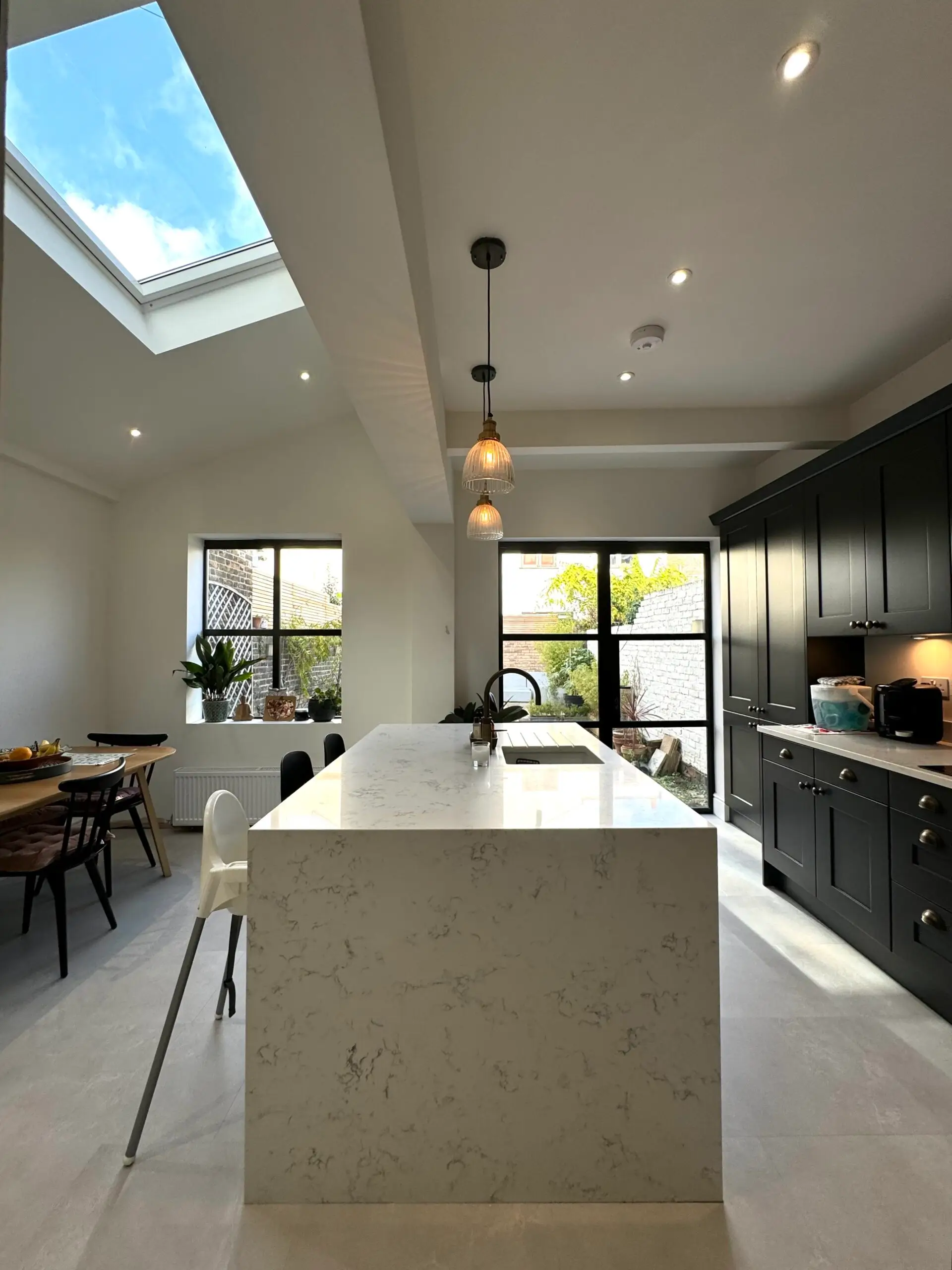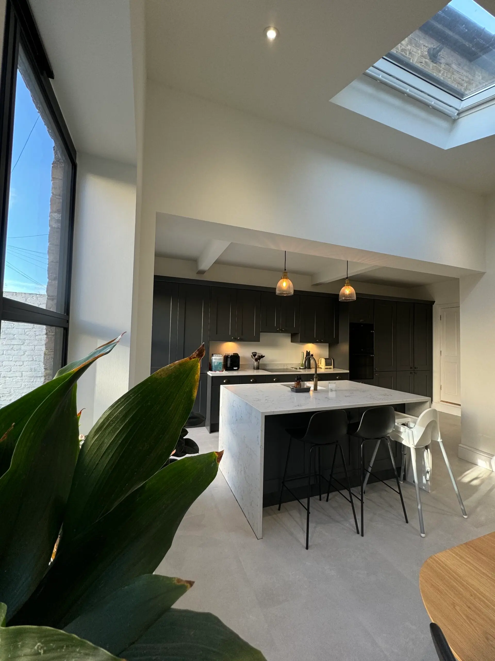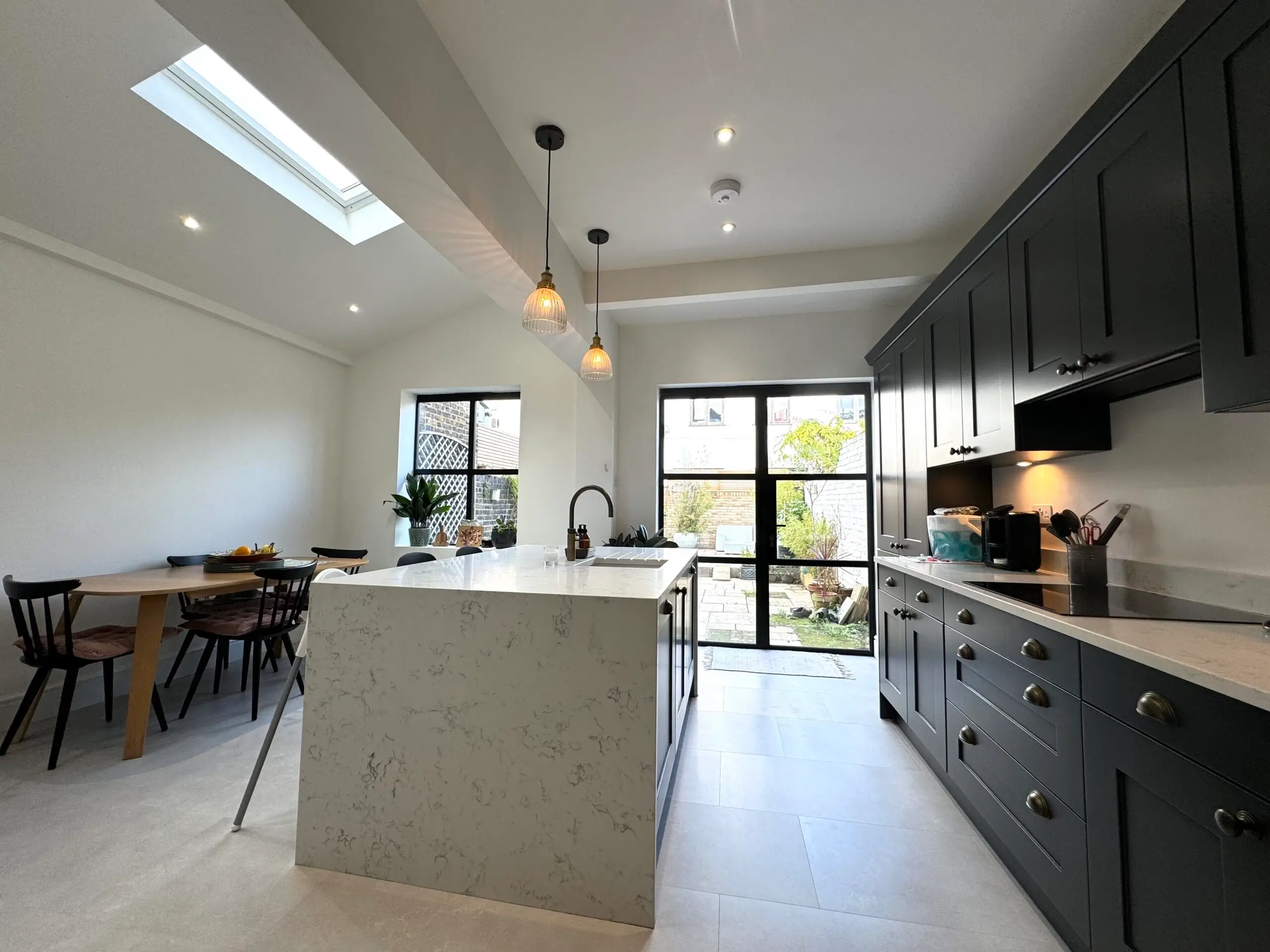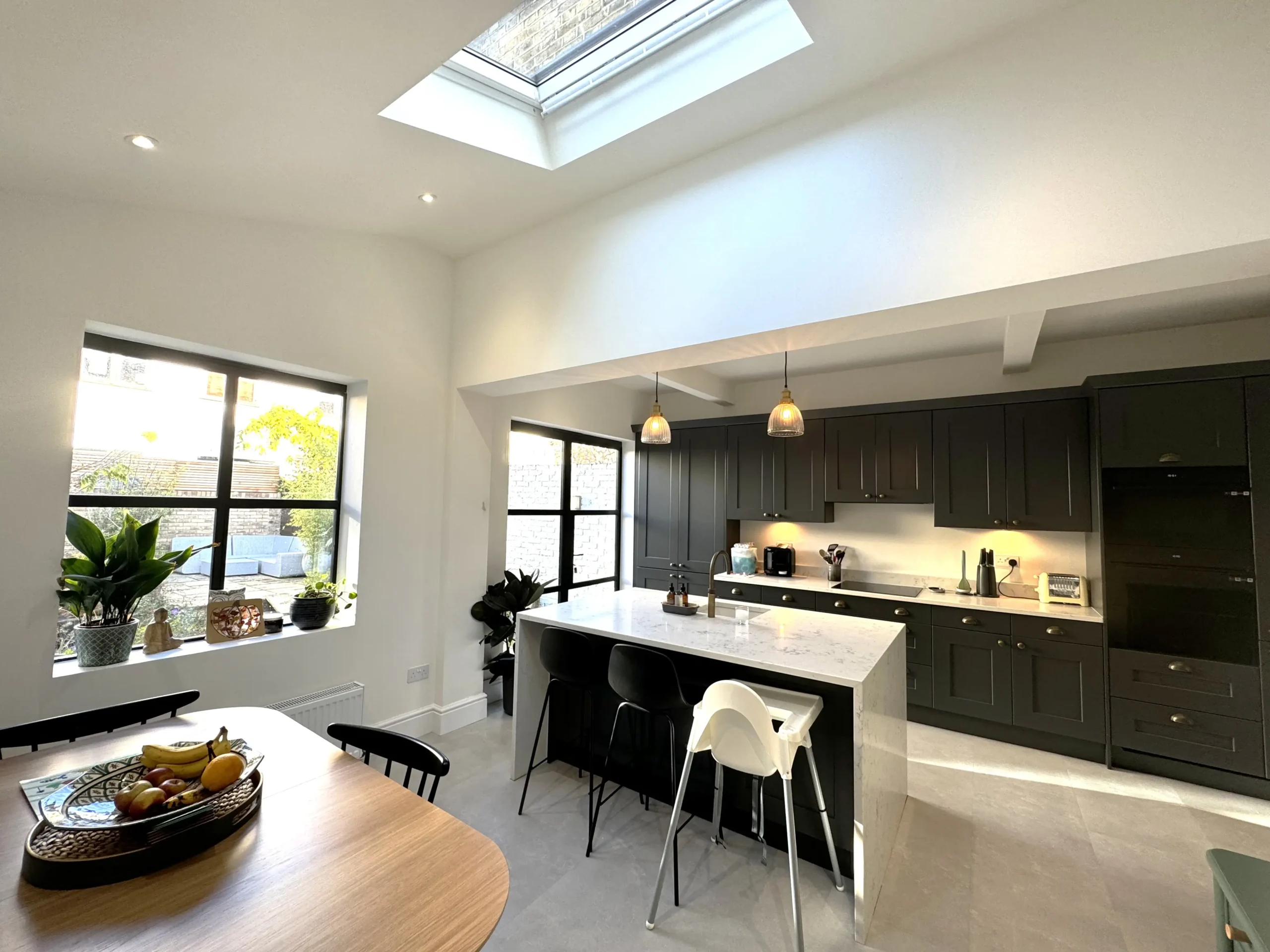 This modern Windsor home extension transforms a traditional ground floor into a light-filled, open plan kitchen and dining space. Featuring skylights, glazed doors, and seamless garden access, the design blends contemporary elegance with everyday functionality.