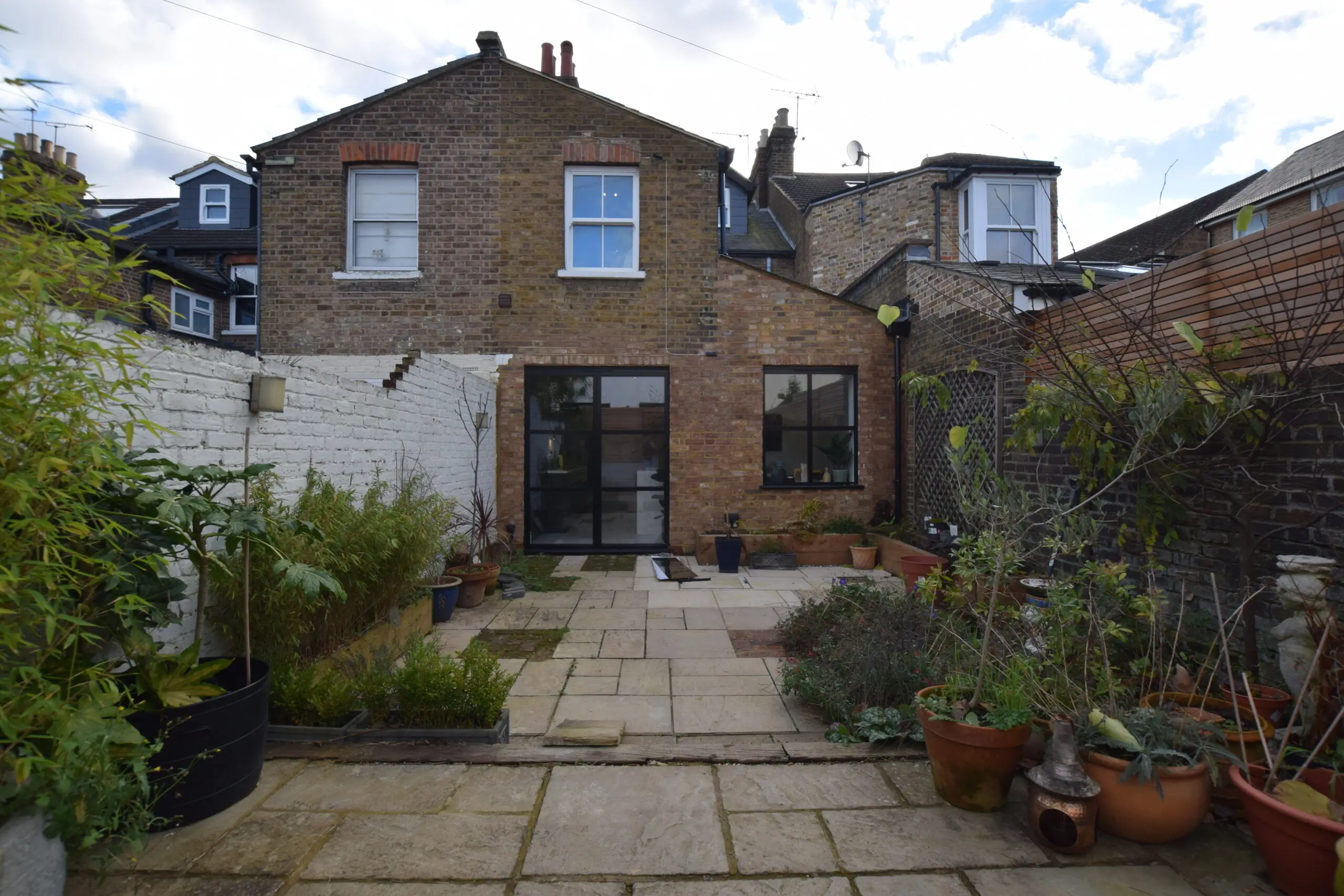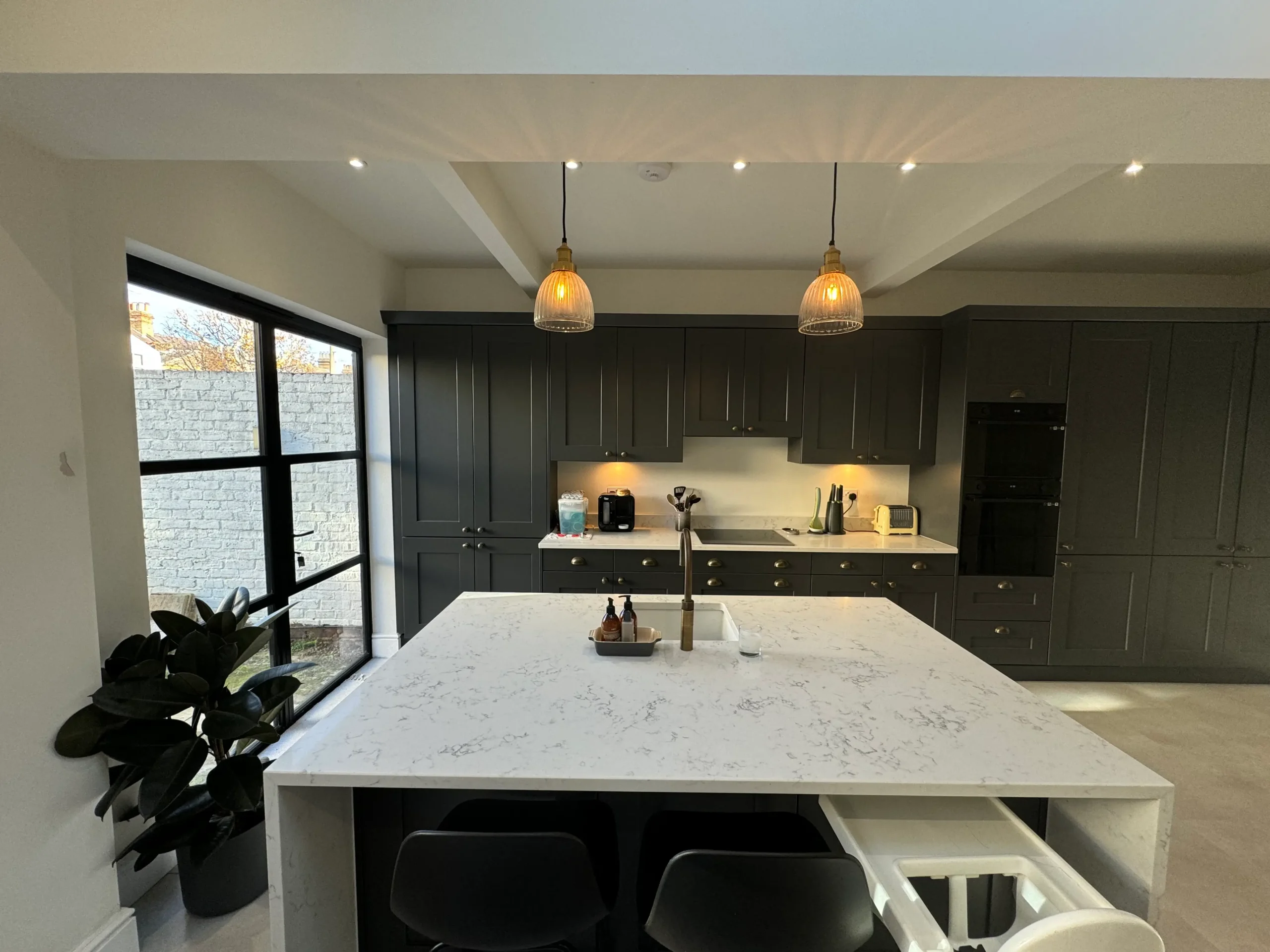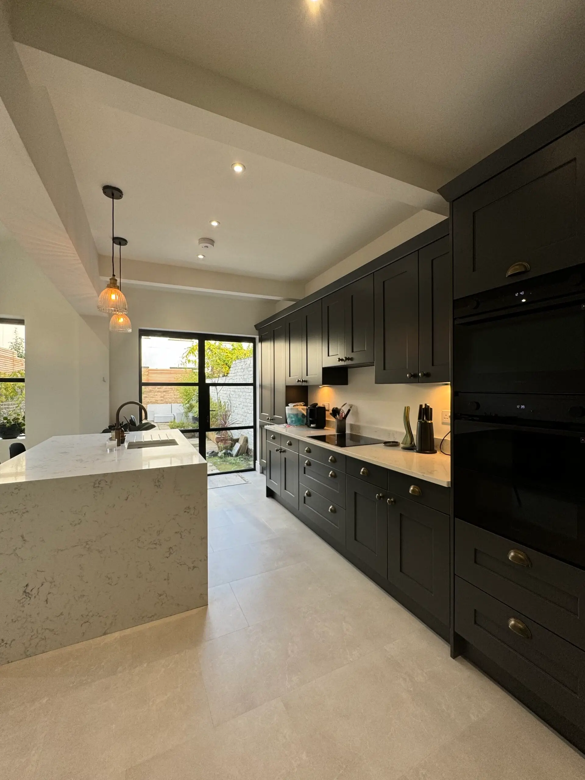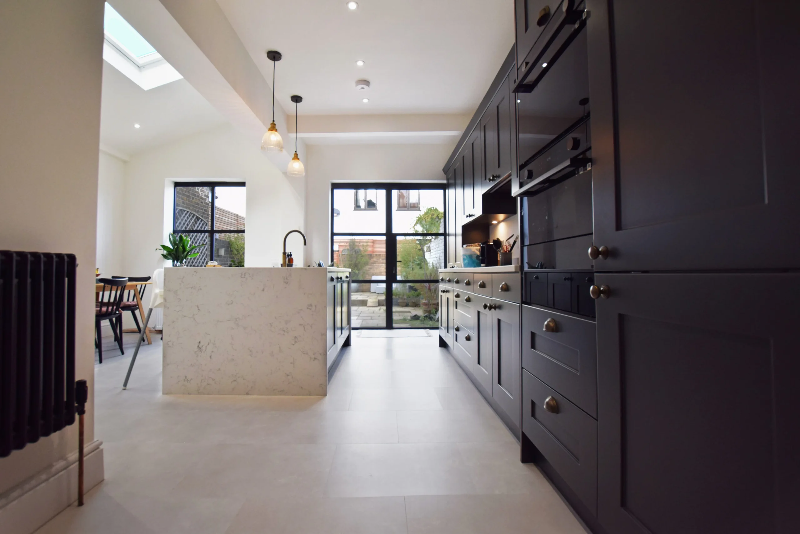 This modern Windsor home extension transforms a traditional ground floor into a light-filled, open plan kitchen and dining space. Featuring skylights, glazed doors, and seamless garden access, the design blends contemporary elegance with everyday functionality.